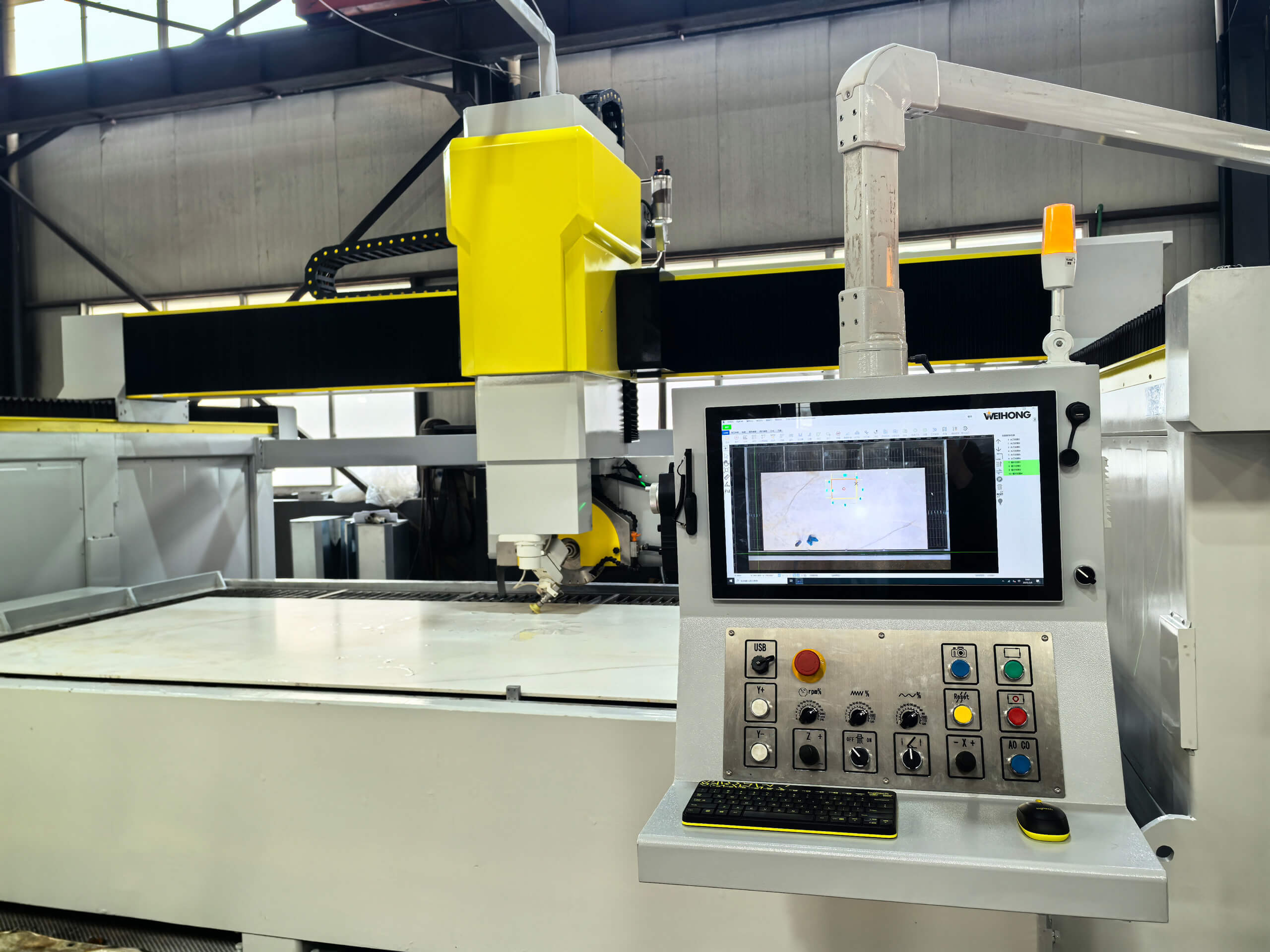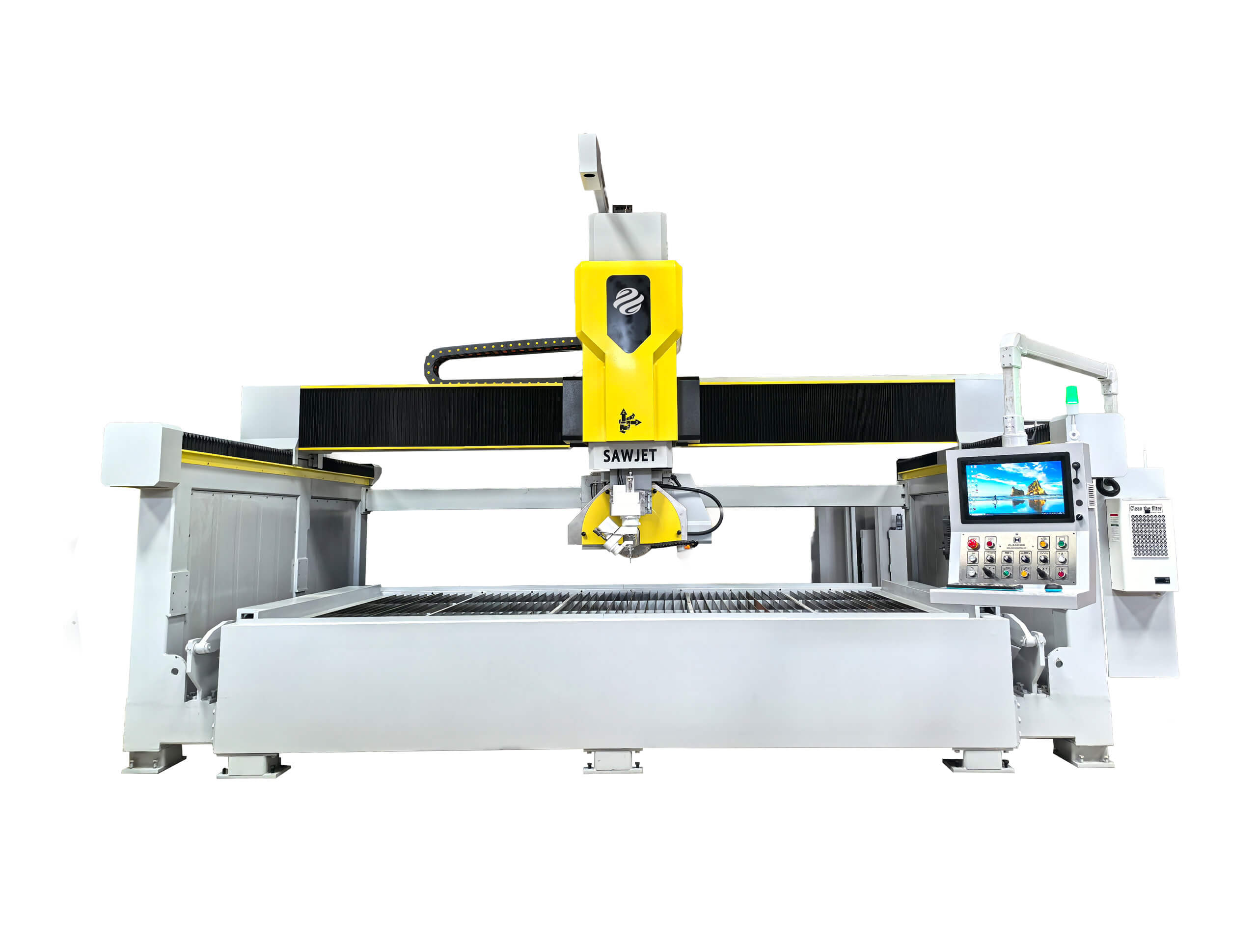 It’s CNC Sawjet Machine,Type: ZLSJ-425CNC/5A, combined function of WaterJet and Bridge Saw. This machine can not only perform efficient Line cutting by Blade Saw, but also can process various curves and small angles by Water jet. It can process stones with high hardness , such as sintered stone, porcelain, ceramic, etc. Making it easy for stone chamfering, basin hole and internal angles processing. The processing method of this machine is flexible and convenient, with a high degree of automation and simple operation. It is currently the most advanced stone processing machine in the stone industry.